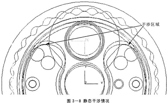 后三種都是實際結(jié)構(gòu)可能存在的,當(dāng)出現(xiàn)第一種干涉即硬干涉時就要引起高度重視,這可能是:設(shè)計存在問題,必須及時糾正。就是借助此功能,造型完成后,本人發(fā)現(xiàn)輸出盤與擺紅、輪間有硬干涉(見圖3-8),與設(shè)計此減速器的部門交換意見,原來他們在設(shè)計完后沒有發(fā)現(xiàn)此問題,等制造出成品后才發(fā)現(xiàn),便通過手工磨削將干涉部分除去。此處也充分體現(xiàn)了與傳統(tǒng)的設(shè)計方法相比,虛擬樣機技術(shù)有著不可比擬的優(yōu)越,即在制造第一臺物理樣機前就發(fā)現(xiàn)了機構(gòu)在結(jié)構(gòu)方面的缺陷。至于機構(gòu)的優(yōu)化和性能改進(jìn)方面,通過后面的仿真分析更能清楚地展現(xiàn)虛擬樣機技術(shù)的優(yōu)越。