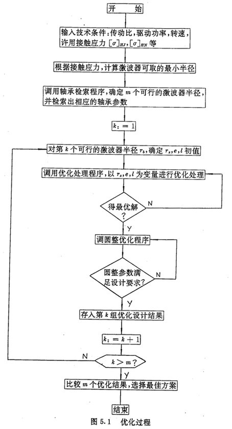 由于激波器一般使用通用軸承,所以激波器半徑Tb應(yīng)結(jié)合軸承標準來選擇。在程序中,先給各傳動參數(shù)指定其取值范圍的中間數(shù)值,然后根據(jù)接觸應(yīng)力計算,確定滿足強度條件的最小激波器半徑,由軸承檢索程序,確定若干個可行的激波器半徑。在確定可行的激波器半徑時,為了使減速器外徑尺寸不致過大,僅把與應(yīng)力計算結(jié)果相近的軸承半徑及其相鄰型號半徑作為可行的激波器半徑。對每一個可行的激器半徑Tb,調(diào)用優(yōu)化子程序以TZ,e,l為優(yōu)化變量進行優(yōu)化處理。其算法流程如圖5.1所示。
