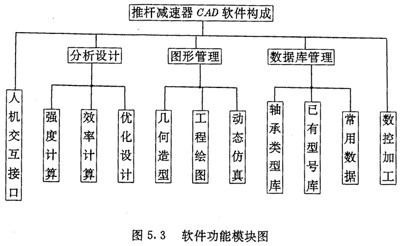 軟件主要由分析設(shè)計、圖形管理、數(shù)據(jù)庫管理及摟控加工四大部分組成,并提供了一個友好的人機交互接口界面用于實現(xiàn)漢字人機對話。本交互接口由三級推拉彈出式菜單組成。軟件模塊結(jié)構(gòu)如圖5.3所示。各大模塊的主要功能及特點如下: