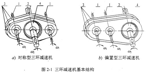 星型少齒差減速機雖然只有一片內(nèi)齒環(huán)板,結(jié)構(gòu)簡單,易于滿足傳力條件和裝配條件。但是它的環(huán)板軸承所受載荷在傳遞相同的輸出扭矩的情況下比對稱型、偏置型三環(huán)減速機大很多,環(huán)板及其軸承較易損壞,在設(shè)計和實際使用中應(yīng)避免采用這種結(jié)構(gòu)布置形式。