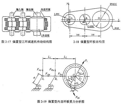 其次分析偏置型三環(huán)減速機的情況,圖2-17所示為偏置型三環(huán)減速機傳動結(jié)構(gòu)圖,偏置型三環(huán)減速機的一塊環(huán)板的結(jié)構(gòu)如圖2-18所示,它的受力情況和坐標系選取如圖2-19所示,符號的標定及含義同對稱型三環(huán)減速機。