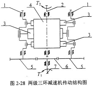 三環(huán)減速機是為適應(yīng)現(xiàn)代機械設(shè)備對傳動機構(gòu)的新要求而開發(fā)的一種以漸開線少齒差行星齒輪傳動原理工作的新型傳動裝置,本文所研究的三環(huán)減速機傳動結(jié)構(gòu)如圖2-28所示,它由兩根二級高速偏心輸入軸1,低速輸出軸2,三片內(nèi)齒環(huán)板(兩塊兩側(cè)環(huán)板3和一塊中間環(huán)板3′)和外齒輪4構(gòu)成。三片內(nèi)齒環(huán)板偏心安裝在兩根高速軸上1上,為了克服二級偏心輸入軸的死點位置和增大傳動比,采用兩個分流定軸齒輪5分別帶動兩個偏心輸入軸,而齒輪5則由一級輸入軸7上的主動齒輪6帶動。三個內(nèi)齒環(huán)板偏心之間的相位差為π,并且考慮慣性力平衡,中間環(huán)板的厚度取為兩側(cè)環(huán)板厚度的2倍,它們都與外齒輪4相嚙合,外齒輪4安裝在輸出軸2上,各軸均平行配置。