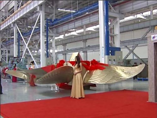 了快速地發(fā)展,產(chǎn)品深得海內外客戶的信賴,公司已累計生產(chǎn)固定槳3000 余件、可調槳600余套。2009 年8 月28 日,中國傳動戰(zhàn)略投資同舟,技改投入2.55 億元。自去年底新廠區(qū)試生產(chǎn)至今已累計交付47500DWT、82000DWT、176000DWT 配套的螺旋槳產(chǎn)品10 余套。