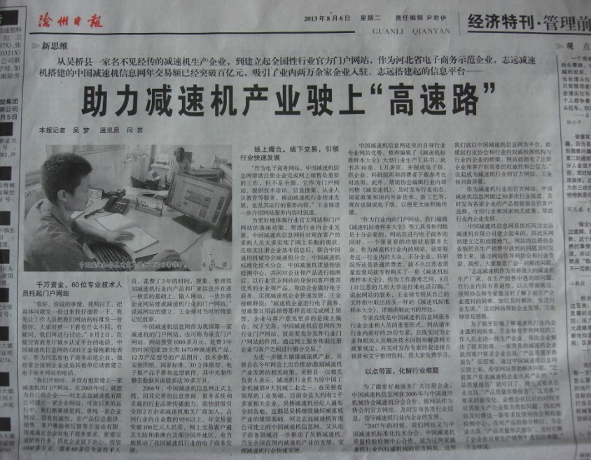 ![]() 8月2日,滄州日報記者吳夢在吳橋縣宣傳部閆巖的陪同下,對減速機信息網(wǎng)進行了深入的采訪。8月6號,滄州日報刊登了財經專題報道“助力減速機產業(yè)駛上高速路”。以下是報道全文: