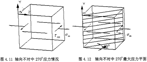 此時的受力由圖上可以看出,屬于空間應力狀態(tài),其基本分析過程類似于徑向不對中900狀態(tài),現在將徑向不對中2700時的受力情況:σxx=0,σyy=0,σzz=0,τxy=-τrot,σyz=0,σzx=0,σzx=τrod分別代入式(4-29)(4-30)(4-31),得到