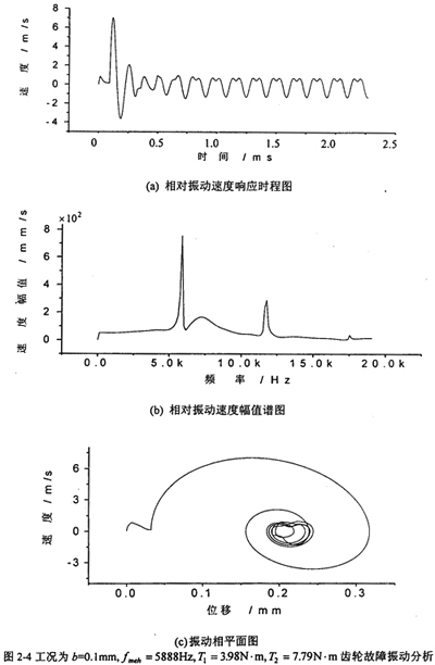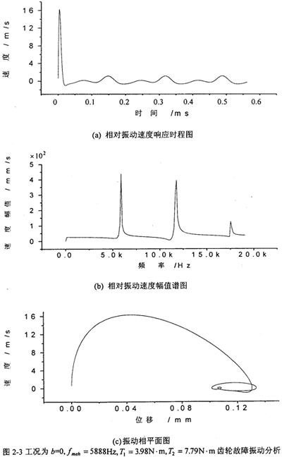 的計算結(jié)果,圖2-3~圖2-13為各種工況的齒輪故障振動分析,其中包括齒輪輪齒相對振動速度時程響應(yīng)圖、齒輪輪齒相對振動速度幅值譜圖和相平面圖。