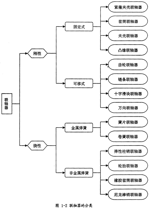 就聯(lián)軸器種類而言,若按補(bǔ)償兩軸相對(duì)位移能力的不同可分為:剛性聯(lián)軸器和撓性聯(lián)軸器;剛性聯(lián)軸器按能否允許兩軸有相對(duì)位移又可分為:固定式聯(lián)軸器和可移式聯(lián)軸器;撓性聯(lián)軸器按其彈性元件的不同可分為金屬?gòu)椈陕?lián)軸器和非金屬?gòu)椈陕?lián)軸器;若按結(jié)構(gòu)可分為套筒聯(lián)軸器、鏈條聯(lián)軸器、輪胎聯(lián)軸器等等。其總的分類圖如圖1-2所示。