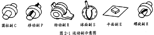 在等角速萬向聯(lián)軸器中,大部分都屬于連桿機構(gòu).最古老的雙聯(lián)十字軸萬向聯(lián)軸器機構(gòu)就是球面四連桿機構(gòu)。從大量的不同的機構(gòu)綜合中,有可能得出多種實用的等角速連桿機構(gòu),所以研究等角速理論,以連桿機構(gòu)的型式和尺度關(guān)系為對象,進行新的等角速理論的探索,在一定的意義上是可行的。在機構(gòu)學上,構(gòu)件同構(gòu)件間的連接稱為副,其不同的形式和代號如圖2-1所示: