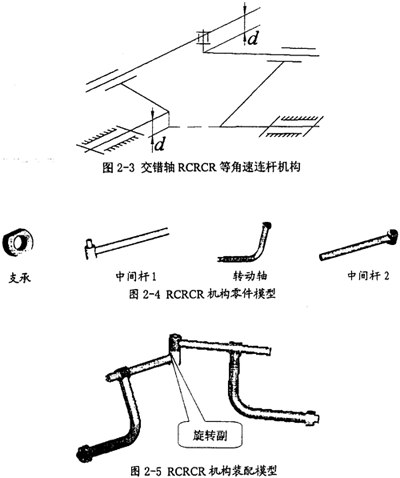 通過上述的方法,可以得到相交軸、交錯軸形式的多種等角速連桿機構(gòu)。在圖2-2中列出了其中的一部分,它們都是相交軸傳動的形式,當然全都是鏡面機構(gòu)。在這些機構(gòu)中有的已被應(yīng)用在等角速聯(lián)軸器上,如球鉸柱塞式萬向聯(lián)軸器就是以RPSPR機構(gòu)為基礎(chǔ)。在圖2-3中列出了其中的一種較重要的交錯軸形式的等角速連桿機構(gòu)。