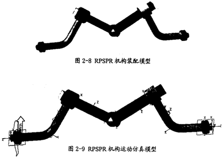 在圖2-8所示模型的基礎(chǔ)上,通過在各構(gòu)件間加上運動副,在運動副上施加運動驅(qū)動,即可得到此機構(gòu)的運動仿真模型(如圖2-9所示)。在此模型的建立過程中嚴格保證各構(gòu)件的共面,其運動副的形式同圖2-2中的RPSPR機構(gòu)均相同。這樣在此模型中有4個構(gòu)件(不含機架)、有2個旋轉(zhuǎn)副、有2個移動副、有l(wèi)個球面副、模型有l(wèi)個自由度,再加上l個運動驅(qū)動即可得到完整的仿真模型。不過此模型并不滿足鏡面機構(gòu)的條件。