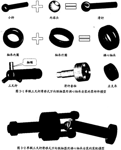 三叉桿滑移式萬向聯(lián)軸器由滑桿套軸(又稱為輸入軸)、三叉桿(又稱為輸出軸)、小桿和內(nèi)球頭等組成產(chǎn)(這幾個(gè)構(gòu)件的模型圖3-1所示),其中小桿和內(nèi)球頭裝配成滑桿(模型的裝配關(guān)系如圖3-l最上部),在這種連接形式下,內(nèi)球頭可在小桿內(nèi)轉(zhuǎn)動(dòng),即形成球面副,具有三個(gè)轉(zhuǎn)動(dòng)自由度。在滑桿套軸上有三個(gè)均勻分布的孔(小桿的滑道),與安裝在三叉桿軸頸上的滑桿相配合,這里所有的配合均為間隙配合。當(dāng)三叉桿萬向聯(lián)軸器運(yùn)轉(zhuǎn)時(shí)(兩軸有夾角),滑桿一方面沿滑道的中心線移動(dòng),另一方面沿三叉桿軸頸移動(dòng),從而實(shí)現(xiàn)運(yùn)動(dòng)過程中的角度補(bǔ)償。