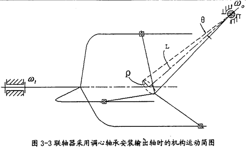)為半徑的圓,其中R為輸入軸滑道軸線到輸入軸軸線的距離(圖3-4中有其示意),β為輸入、輸出兩軸線之間的夾角(圖3-5中有其示意),L為圓錐擺中軸線長。所以采用調(diào)心軸承安裝輸出軸時(shí),輸出軸的運(yùn)動(dòng)必為一圓錐擺運(yùn)動(dòng),三叉桿中心的偏心距ρ與比值