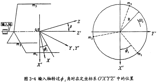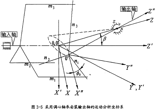 由于輸出軸作一圓錐運(yùn)動(dòng),在分析的過程中需建立三套坐標(biāo)系,如圖3-5所示。