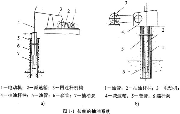 傳統(tǒng)的采油設(shè)備主要以游梁式抽油機(jī)(圖1-la)為主,其由三部分組成:一是地面部分-游梁式抽油機(jī),包括電動(dòng)機(jī)、減速箱和四連桿機(jī)構(gòu);二是井下部分-抽油泵,它懸掛在套管中油管的下端;三是聯(lián)系地面和井下的中間部分-抽油桿柱,它由一種或幾種直徑的抽油桿和接箍組成。游梁式抽油機(jī)的優(yōu)點(diǎn)是結(jié)構(gòu)簡單、制造容易、維護(hù)方便,缺點(diǎn)是抽油泵排量太小,一般為50~100米3/天。而且該系統(tǒng)含砂敏感,地面驅(qū)動(dòng)部分體積龐大。為了減輕抽油機(jī)的重量,人們又開發(fā)了無游梁式抽油機(jī),它分為機(jī)械無游梁式抽油機(jī)和液壓無游梁式抽油機(jī)兩種。它們的共同特點(diǎn)是保留抽油桿和原來的抽油泵,維持有桿泵抽油設(shè)備的工作方式。無游梁式抽油機(jī),特別是液壓無游梁式抽油機(jī)的采用,可以降低抽油桿中的應(yīng)力和改善它的工作條件,因而擴(kuò)大了有桿泵抽油設(shè)備的使用范圍。然而,無論是游梁式抽油機(jī)還是無游梁式抽油機(jī),由于其抽油泵固有的結(jié)構(gòu)特點(diǎn),在抽取含砂、含氣、含水、含蠟、含膠質(zhì)、含石膏的原油、稠油和低滲透層原油時(shí),均無法滿足工作要求。