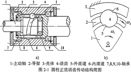 圖2-1所示為圓柱正弦活齒傳動機(jī)構(gòu)的結(jié)構(gòu)簡圖,圓柱正弦活齒傳動由主動軸、殼體、導(dǎo)架及活齒這四個部分組成。殼體的內(nèi)圓柱表面上有周期數(shù)為Z3的內(nèi)正弦滾道,軸承7、8、9、10支撐導(dǎo)架,導(dǎo)架圓周面上均勻分布著軸向活齒槽。軸承7、9支撐主動軸,其外圓柱面上有周期數(shù)為Z1的外正弦滾道,在內(nèi)滾道、外滾道及導(dǎo)架活齒槽的交錯區(qū)域內(nèi)安裝有球形活齒。