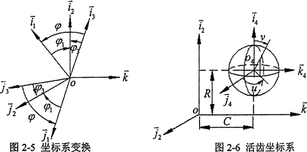 為建立該傳動的嚙合方程,使在不同坐標(biāo)系中的各個矢量進(jìn)行計(jì)算,需將所有矢量轉(zhuǎn)換到統(tǒng)一的坐標(biāo)系中,為方便求解,將所有矢量均轉(zhuǎn)換到導(dǎo)架的坐標(biāo)系σ2中。