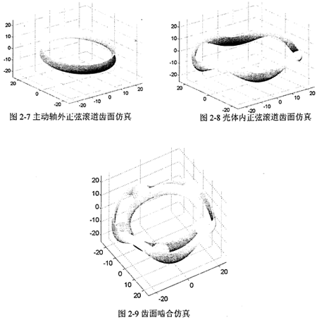 采用Matlab工程軟件對圓柱正弦活齒傳動進(jìn)行齒面仿真的研究。為仿真出三維曲面,在接觸線上劃分100個單元,在齒面圓周方向劃分1001個單元,由此將齒廓曲而劃分為100×1001的網(wǎng)格。根據(jù)數(shù)學(xué)模型計(jì)算出各個網(wǎng)格節(jié)點(diǎn)對應(yīng)的數(shù)值,得到齒廓曲面的網(wǎng)格圖,然后采用二維線性插值的方法,得到整個齒廓的曲面仿真及齒面嚙合偏真如圖2-7~圖2-9所示。
