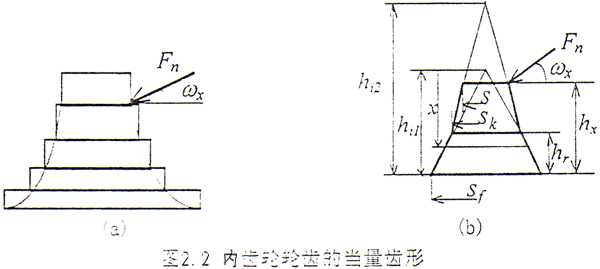 本文將輪齒的齒廓?jiǎng)澐譃槎䝼(gè)梯形,用二個(gè)梯形的彎曲變形、剪切變形、由輪齒基體的彈性傾斜所引起的輪齒的的變形以及輪齒的材料壓縮變形來模擬內(nèi)齒的輪齒變形,故稱之為二梯形當(dāng)量齒形法。這樣處理與Marmol的方法相比更接近實(shí)際的齒廓形狀,而且與外嚙合輪齒的梯形加矩形模型正好對應(yīng)。下面就介紹二梯形當(dāng)量齒形法,將內(nèi)齒輪輪齒劃分為上、下二個(gè)梯形,如圖2.2b所示。