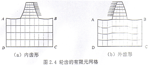 為了與上述方法進(jìn)行數(shù)值比較,在此對內(nèi)、外齒輪的輪齒進(jìn)行有限元法分析。輪齒的有限元網(wǎng)格劃分見圖2.4,輪齒網(wǎng)格的輪廓盡量模擬自然邊界?紤]到彈性基座的傾斜對柔度的影響較大,因此本文取AB=6m,AD=3.25m(m是齒輪的模數(shù))。載荷的分布與齒對的接觸情況有關(guān),對于齒輪聯(lián)軸器齒面接觸比較特殊。本文將載荷均勻地分布于工作齒面上。節(jié)圓處的切向柔度為qt,相應(yīng)的法向柔度[89]q=qtcos2α。計(jì)算結(jié)果見表2.3.
