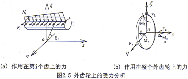齒輪聯(lián)軸器上的受力是比較復(fù)雜的,對于外齒輪而言,除了與聯(lián)軸器連接的軸段對其的作用力外,還有內(nèi)齒套對外齒輪的作用力。轉(zhuǎn)子系統(tǒng)在運(yùn)動(dòng)過程中,內(nèi)外齒輪之間要發(fā)生相對運(yùn)動(dòng),由于齒面間存在變形和摩擦,因此在外齒輪的齒面上會(huì)產(chǎn)生與齒面垂直的正壓力Ni和與齒面相切的摩擦力Fi,見圖2.5a。如果將各齒面上的作用力分別向外齒輪的中心O簡化可以得到作用于O點(diǎn)的一個(gè)力和一個(gè)力偶,并將該力和力偶分別分解到三個(gè)軸上,得到三個(gè)分力Fξ、Fη、Fz三個(gè)力偶矩Mξ、Mη、Mz,如圖2.5b所示。