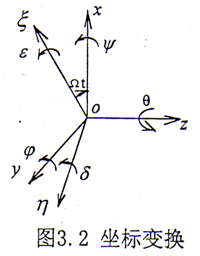 設(shè)將整個軸承—轉(zhuǎn)子—齒輪聯(lián)軸器系統(tǒng)劃分成n個軸段和n個結(jié)點,在第j個結(jié)點處存在一個半齒輪聯(lián)軸器系統(tǒng),如圖3.1所示。將外齒輪和內(nèi)齒套均看作一當量圓盤,并滿足小擾動假設(shè),不計軸向運動,則圓盤的運動可用其中心的位移(xj,yj)和相應(yīng)的偏轉(zhuǎn)角(φj,ψj,θj)來表示,其中三個偏轉(zhuǎn)角的意義見圖3.2。設(shè)oxyz為固定坐標系,oξηz為相應(yīng)的旋轉(zhuǎn)坐標系,下面就以此為模型用拉格朗日方程來建立該子系統(tǒng)的運動微分方程。