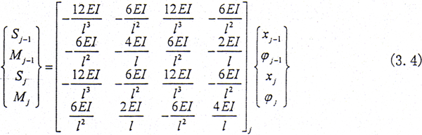 其中 Sj-1,Mj-1,Nj-1,Sj,Mj,Qj,Nj分別為作用于第j-1、j個結(jié)點處軸截面上的剪力和彎矩,根據(jù)平衡方程則第j個軸段在x方向