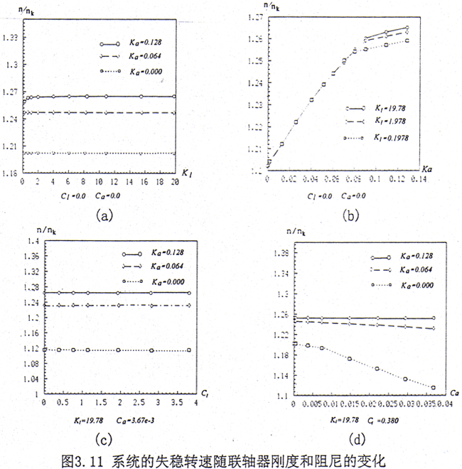 從圖3.11c可見在一定的范圍之內(nèi),齒輪聯(lián)軸器橫向內(nèi)阻尼的變化對(duì)系統(tǒng)的失穩(wěn)轉(zhuǎn)速幾乎沒有影響。由圖3.11d可知,隨齒輪聯(lián)軸器轉(zhuǎn)角內(nèi)阻尼的增加失穩(wěn)轉(zhuǎn)速減小,減少的幅度與系統(tǒng)的轉(zhuǎn)角剛度有關(guān),轉(zhuǎn)角剛度取大值時(shí),系統(tǒng)的失穩(wěn)轉(zhuǎn)速變化甚微,而取小值時(shí),則變化明顯。一般而言,對(duì)于確定的齒輪聯(lián)軸器類型,如果輪齒間的潤(rùn)滑充分對(duì)中良好,則轉(zhuǎn)角內(nèi)阻尼變化不會(huì)太大。所以系統(tǒng)的失穩(wěn)轉(zhuǎn)速也不會(huì)有明顯的變化。但當(dāng)潤(rùn)滑不充分,齒輪聯(lián)軸器對(duì)中不良時(shí),轉(zhuǎn)角內(nèi)阻尼的變化較大,從而會(huì)引起系統(tǒng)失穩(wěn)轉(zhuǎn)速生產(chǎn)較大的變化。