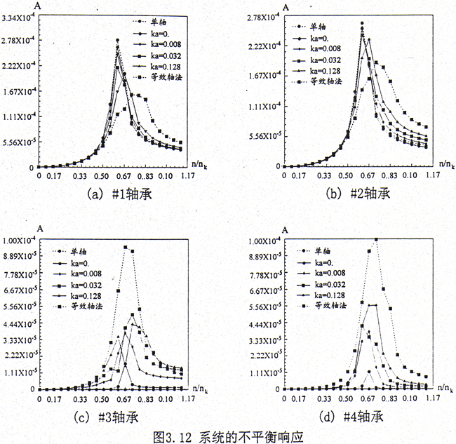 (3)用單軸分析法和等效軸法計(jì)算系統(tǒng)的臨界轉(zhuǎn)速和不平衡響應(yīng)均會(huì)出現(xiàn)較大的誤差。單軸分析法忽視了齒輪聯(lián)軸器對(duì)二側(cè)轉(zhuǎn)子的耦合作用,而等效軸法則過(guò)分夸大了這種作用。