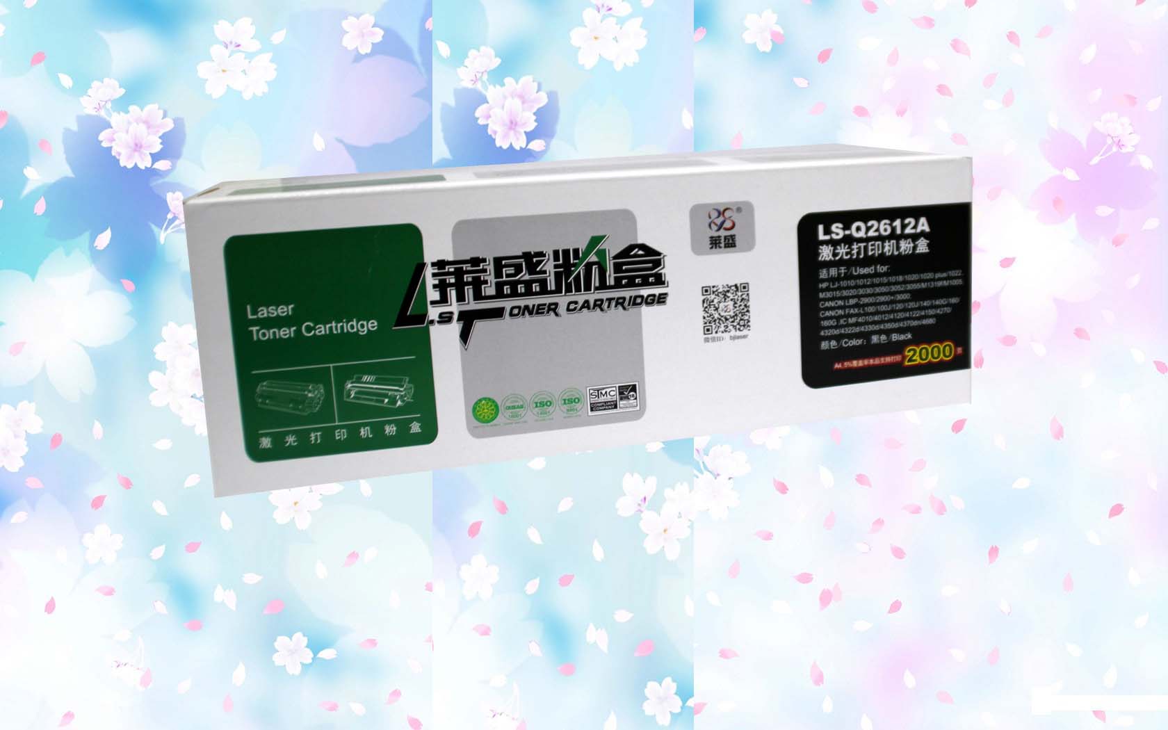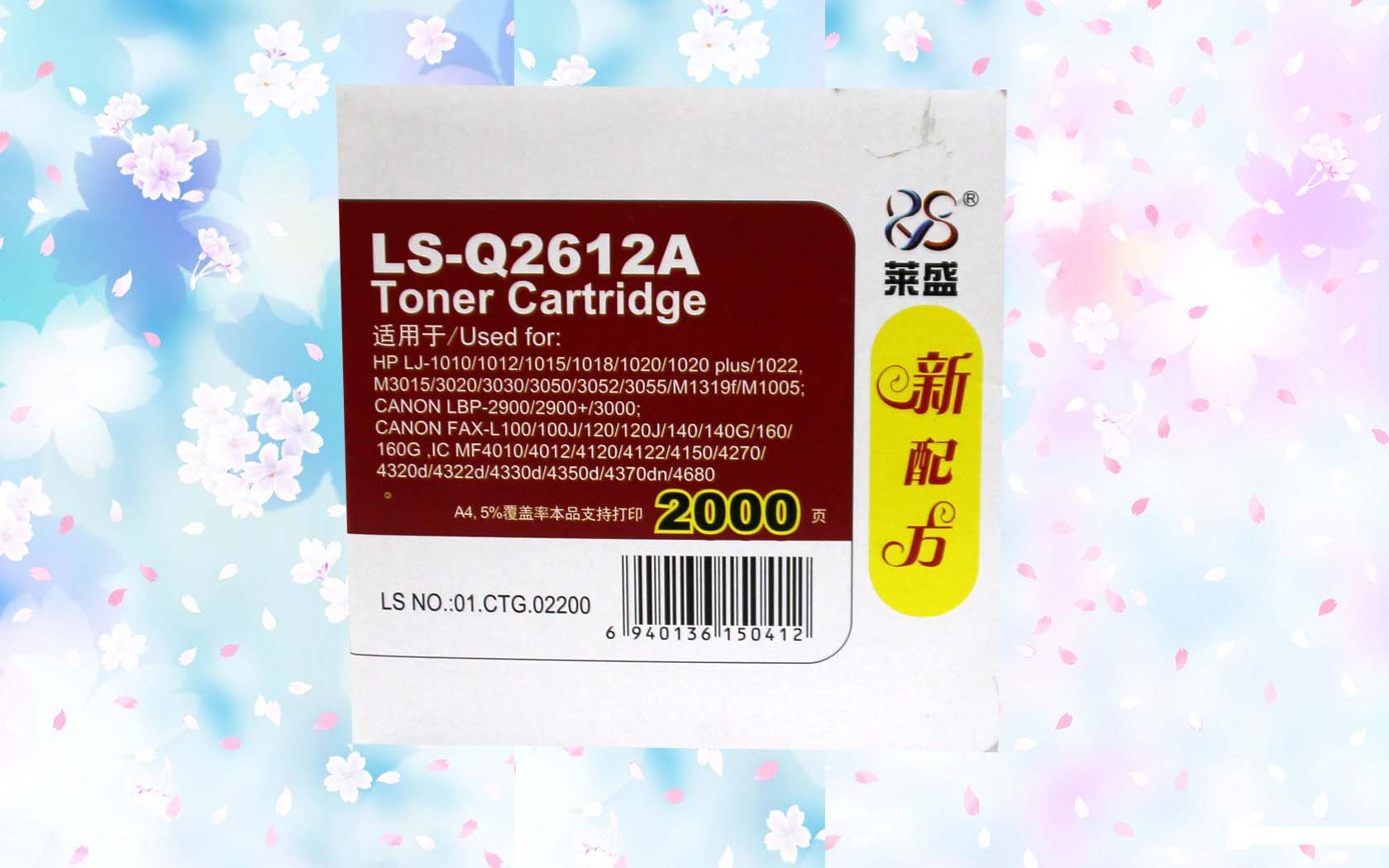 品牌萊盛打印頁數(shù)2000頁型號LS-Q2612A打印幅面A4(5%覆蓋率)顏色黑色保質(zhì)期18個月適用于惠普1010/1018/1020/1022/3015/3020/3030/3050/3055/M1005佳能LBP2900/3000