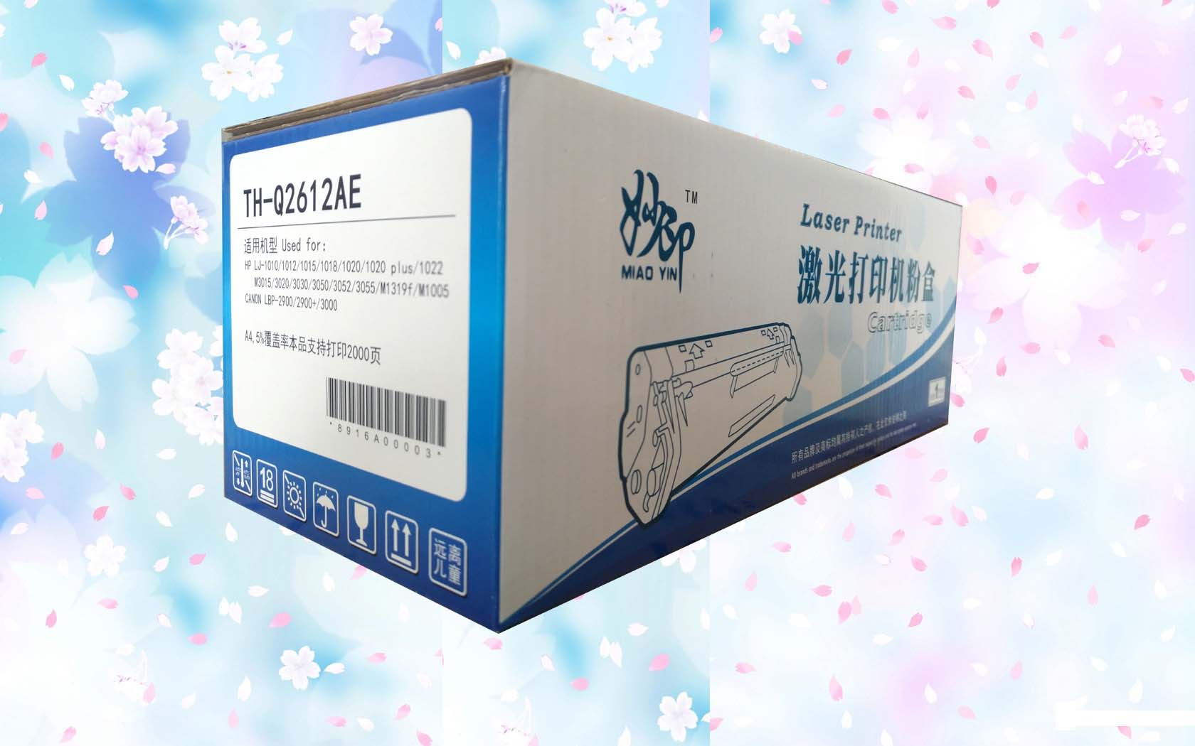 品牌妙印打印頁數(shù)2000頁型號TH-Q2612AE打印幅面A4(5%覆蓋率)顏色黑色保質(zhì)期18個月適用于惠普1010/1018/1020/1022/3015/3020/3030/3050/3055/M1005,佳能LBP2900/3000打印機(jī)