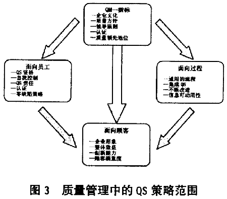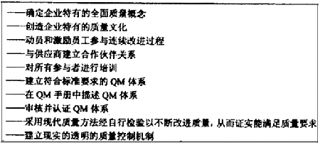 按ISO9000 族標(biāo)準(zhǔn)建立的QM體系以及與此有關(guān)的QM 手冊和為獲得QM 體系認(rèn)證提供有效的QM 體系的證明,都相互影響和支持著QM 方法。這樣,策略上的指導(dǎo)目標(biāo)及成功實(shí)施,在于使質(zhì)量管理確實(shí)成為在市場競爭中立于不敗之地的關(guān)鍵因素。