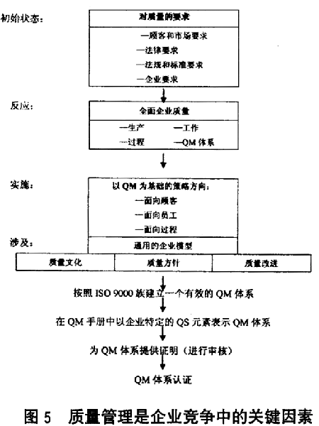 圖5 對本文所討論的企業(yè)競爭中的重要因素——質(zhì)量管理進(jìn)行總結(jié)。出發(fā)點(diǎn)是對各個(gè)方面提出的質(zhì)量要求作詳細(xì)說明。為滿足質(zhì)量要求作出的反應(yīng),是提出全面企業(yè)質(zhì)量概念,這包括與產(chǎn)品、服務(wù)、過程和系統(tǒng)相關(guān)的質(zhì)量元素。